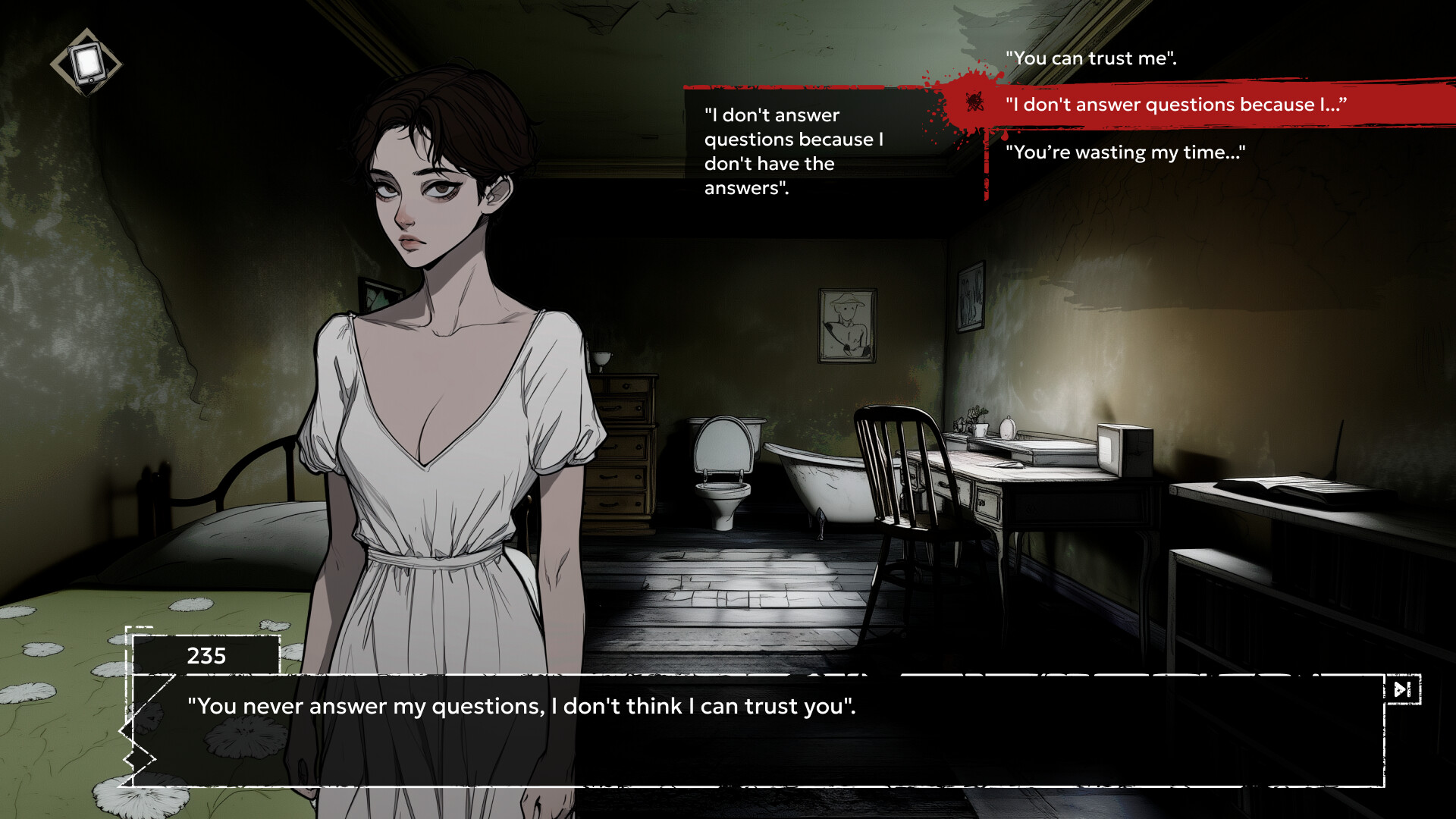• Impact of choices: every choice you make not only affects the current dialogues but also the subsequent events. Your choice may also lead to death, either for you or for any character in the game. There are no immortals here.