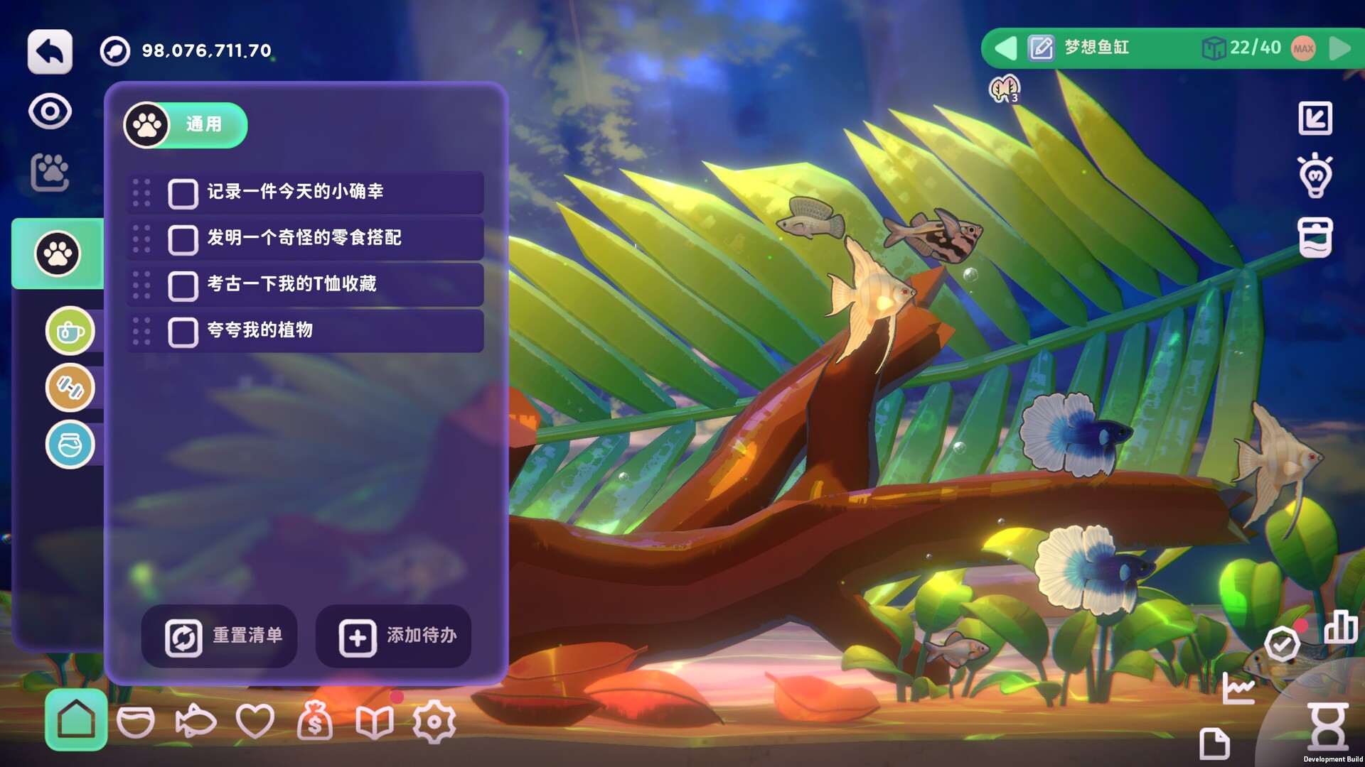 “尽管目前的版本已能基本满足大家沉浸养鱼的乐趣了,但我们计划在正式版本中,玩家可以有更丰富的内容体验。正式版将会添加富有魅力的海水观赏水族;充沛的自然及人工鱼缸布景;更多的巧手和黑巧的形象表现;更多的音乐音效包;更好的鱼生态行为表现;以及其他更多的有趣的收集要素内容。”