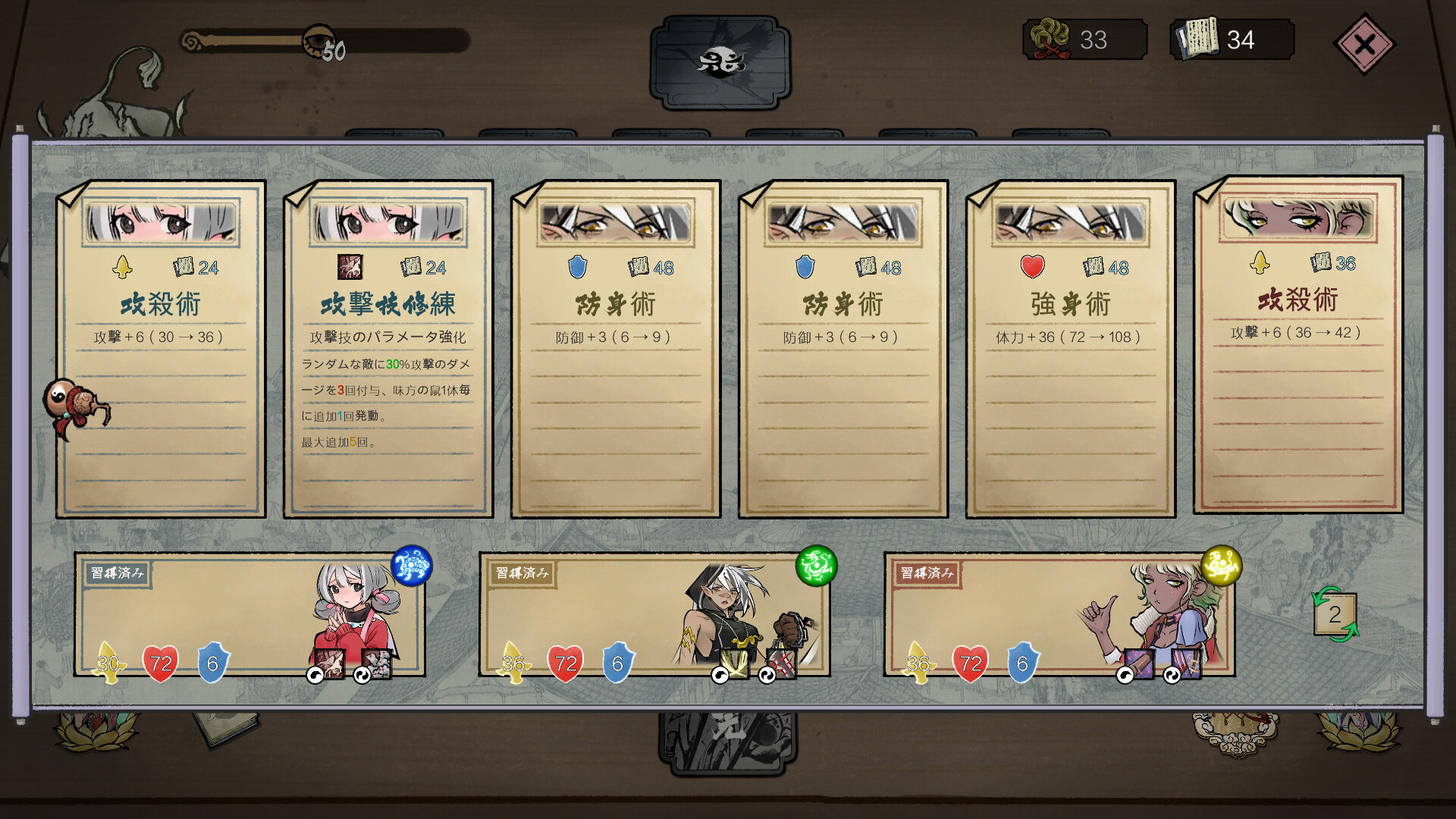 戦闘やランダムイベントで獲得した「銭貨」と「見聞」で娘たちを強化し、多様なパッシブスキルを組み合わせましょう。千変万化の戦術で勝利をつかめ!