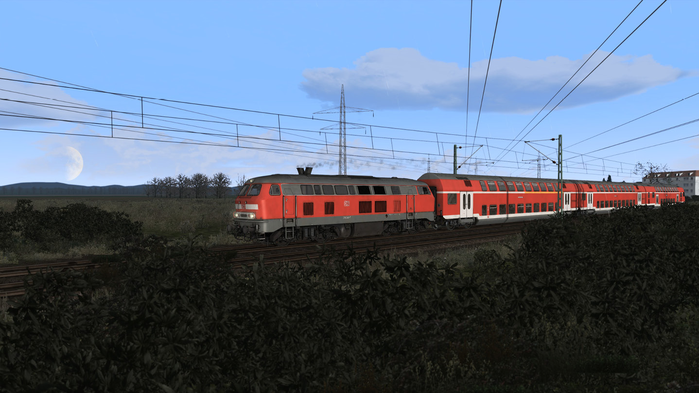 This pack recreates Regional Express services on the Frankfurt – Karlsruhe route, and features the classic BR218 diesel loco, double-decker coaches and DBbzf driving trailer.