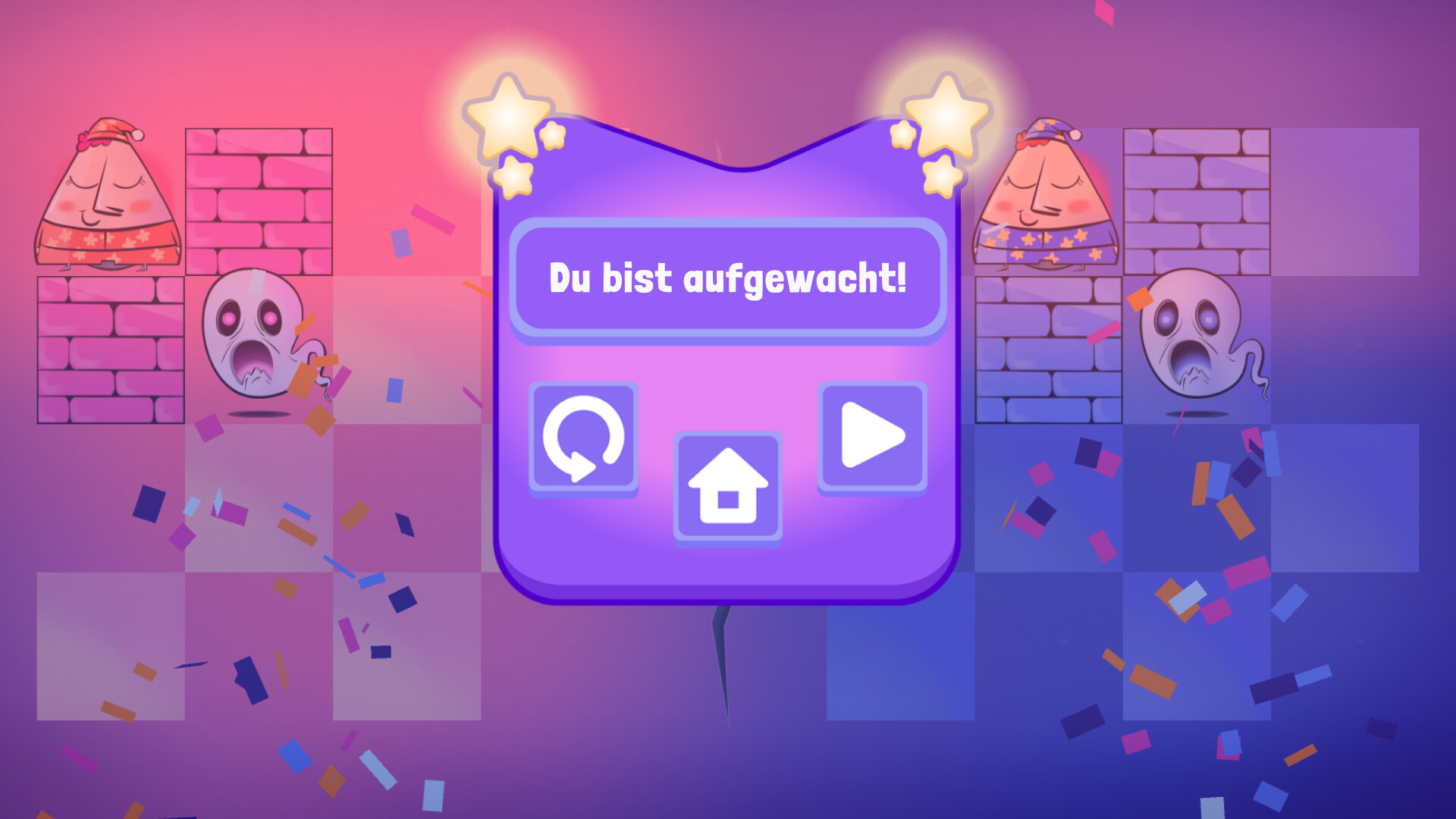 In Twins & Dreams steuerst du zwei Charaktere, die in einer Traumwelt feststecken. Um zu entkommen, musst du beide gleichzeitig zum „WECKEN“-Knopf führen! Aber hier kommt der Clou: Jeder Zug, den du machst, beeinflusst beide Charaktere, und Geister jagen dir nach, wenn du nicht aufpasst!