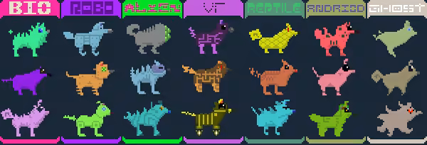 • 70 different breeds across 7 types including normal dogs, robots, aliens, and ghosts