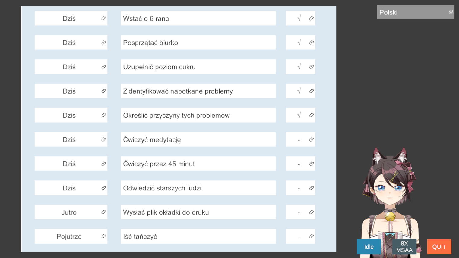 Klikając prawym przyciskiem myszy na ciało postaci, wyświetli się przycisk "QUIT", a za pomocą kółka myszy można przybliżać lub oddalać widok. Ponowne kliknięcie prawym przyciskiem myszy ukryje przycisk "QUIT".