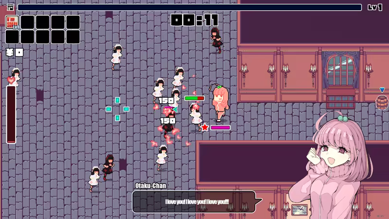 In "Sorry Survivor," the main character becomes irresistible and rejects girls who approach him, aiming for his dream heroine. It's a simple top-down, harem-denying, Vampire Survivors-like 2D action game.
