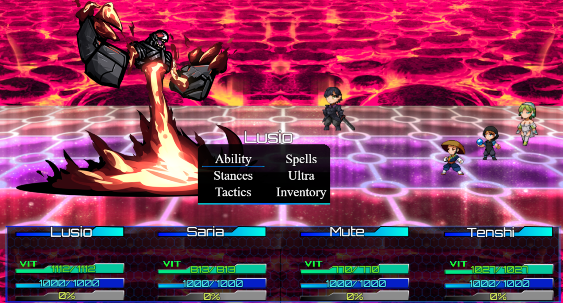 Engage in a Turn Based ATB combat system with Stances, Rows, Ultras, Items, Spells and Abilities to use against your foes and claim victory!