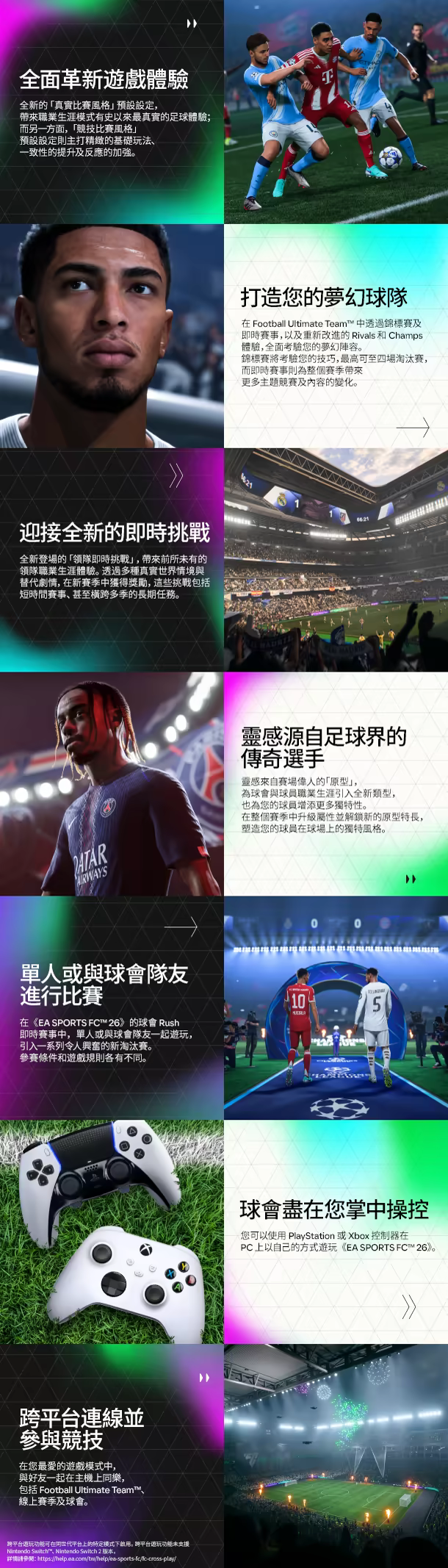 《EA SPORTS FC™ 26》,這是屬於您的球會。參考社群意見、全面改良的遊戲體驗,為新賽季帶來嶄新故事劇情的「領隊即時挑戰」,加上以足壇傳奇選手為靈感的「原型」,讓您可以盡情玩出自己的風格。