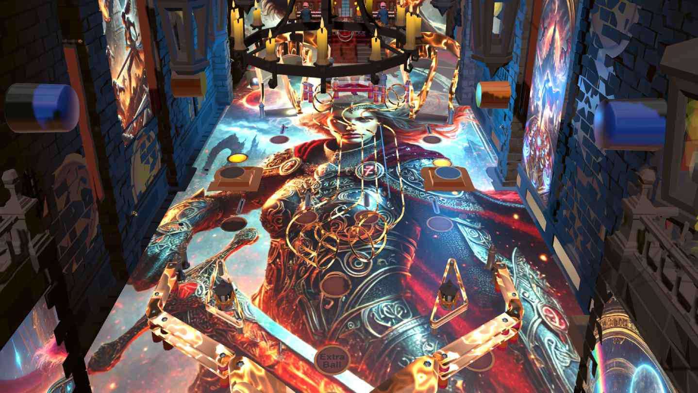 • The table features a powerful warrior with glowing armor and a flaming sword, setting the stage for an intense pinball experience.