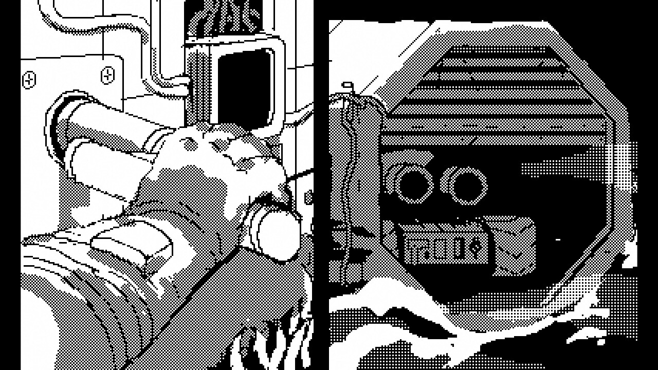 • Dark monochromatic pixel art