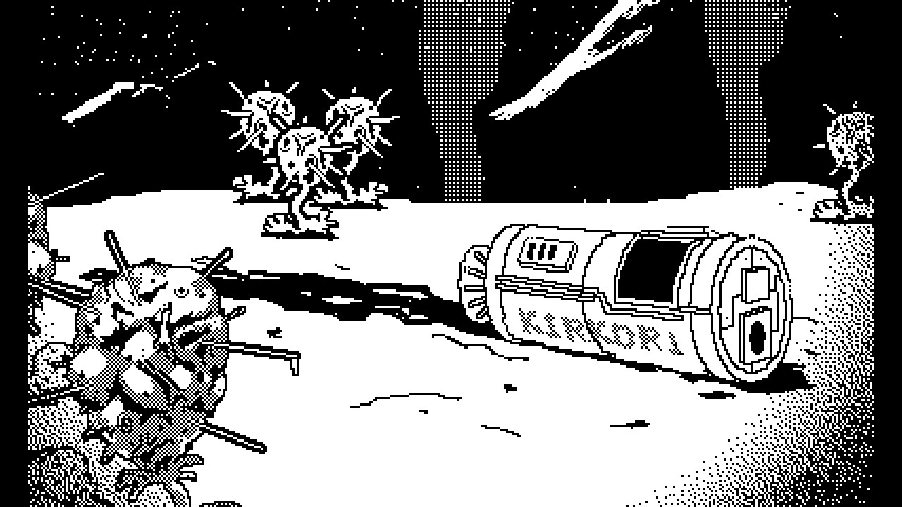 • Dark monochromatic pixel art