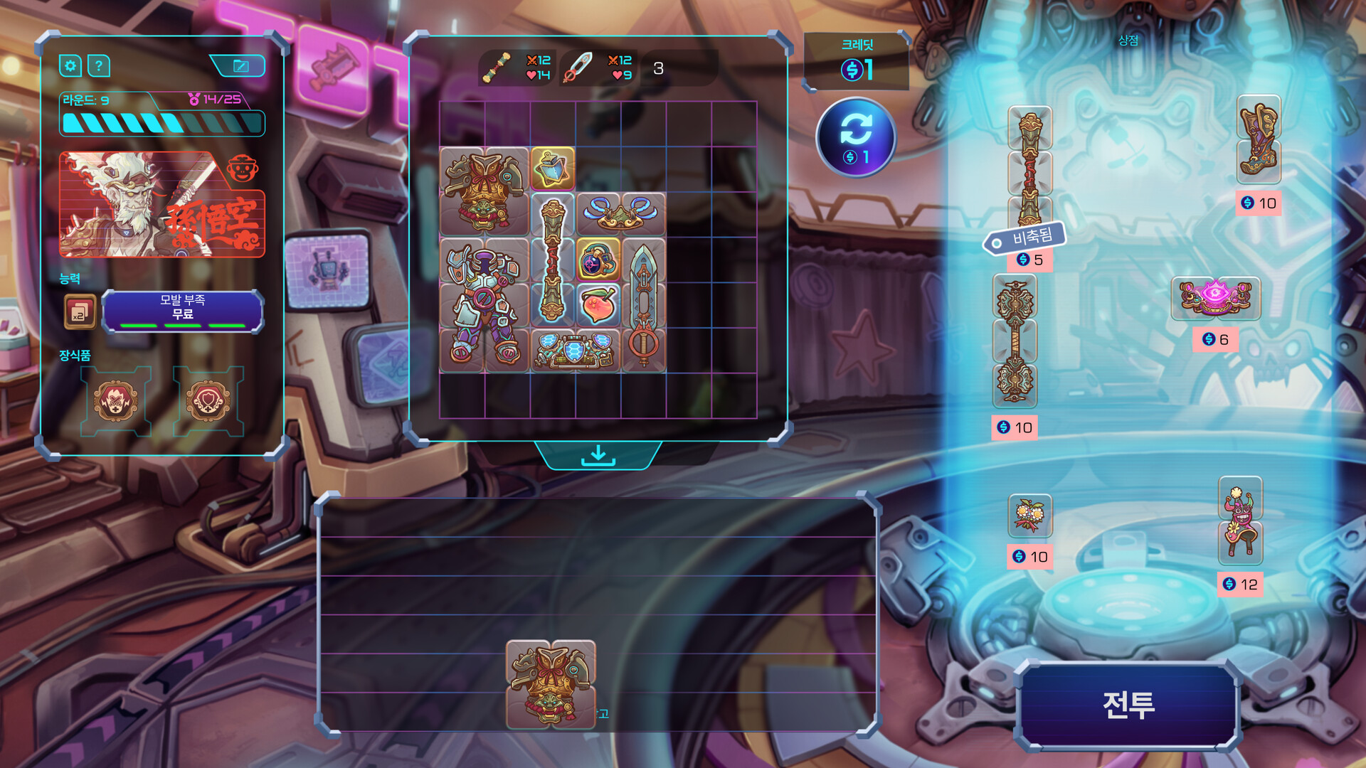 아이템을 합쳐서 업그레이드하여 더욱 강력한 무장을 만들어 보세요! 아이템은 크기, 모양, 효과가 다양하므로 천천히 돌려가며 칸에 신중하게 배치하세요.