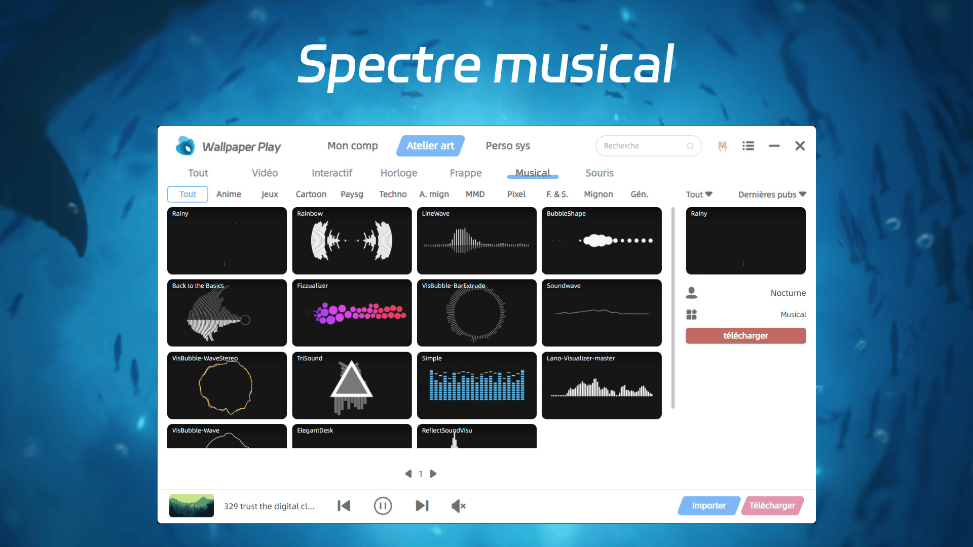 Spectre musical : Plusieurs styles de spectres sont disponibles, qui suivent en temps réel le son du système, visualisant le son et l'affichant sur le bureau. Lorsque la musique joue, le spectre bat et change selon le rythme, créant une atmosphère de bureau pleine d'énergie pour les amateurs de musique.