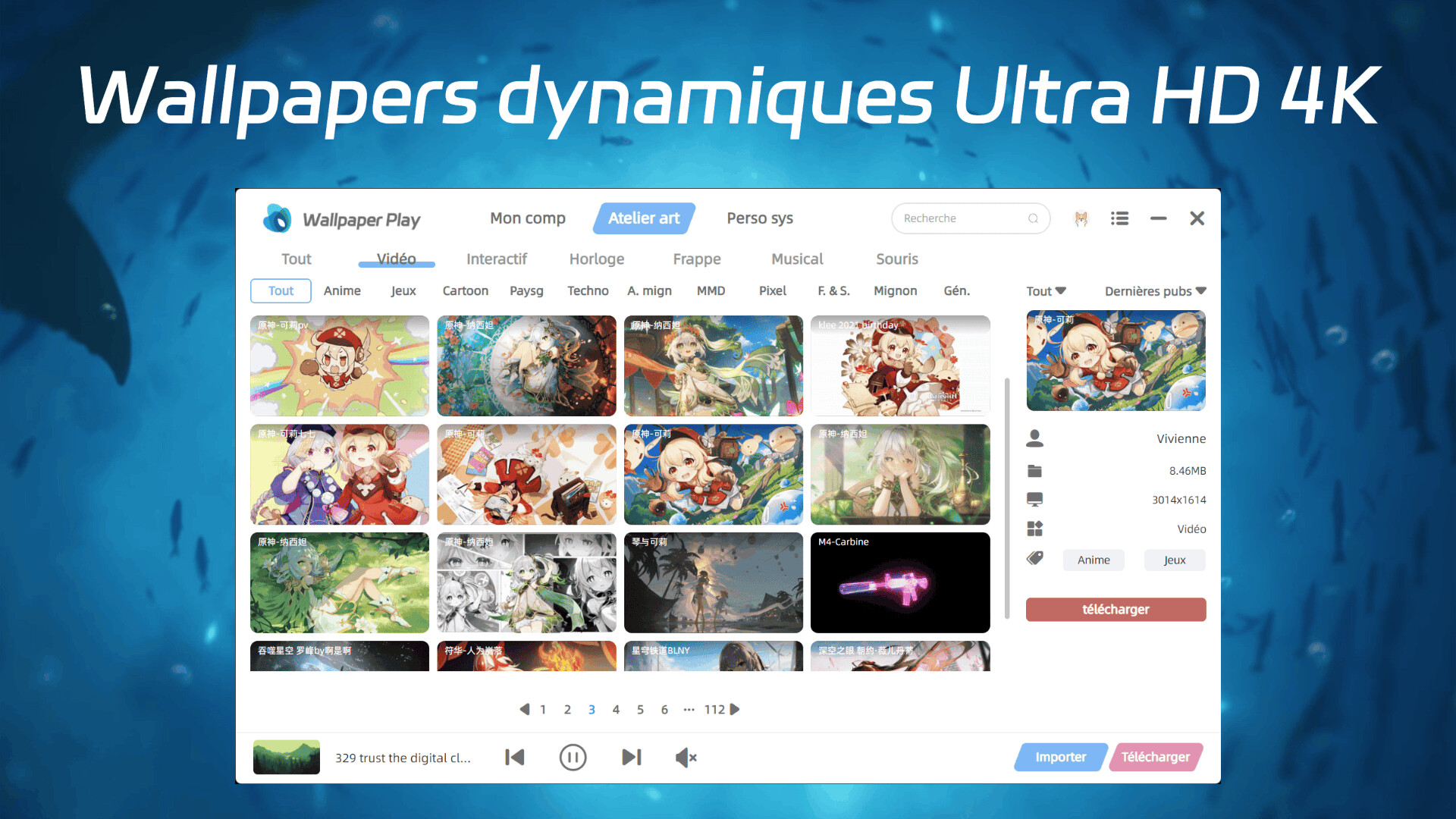Fonds d'écran dynamiques : Prend en charge l'utilisation de vidéos comme fonds d'écran, permettant au bureau de sortir du statique. La « Atelier Créatif » est riche en ressources, offrant de nombreuses vidéos à télécharger, et est constamment mis à jour. Les utilisateurs peuvent également télécharger eux-mêmes des fonds d'écran!