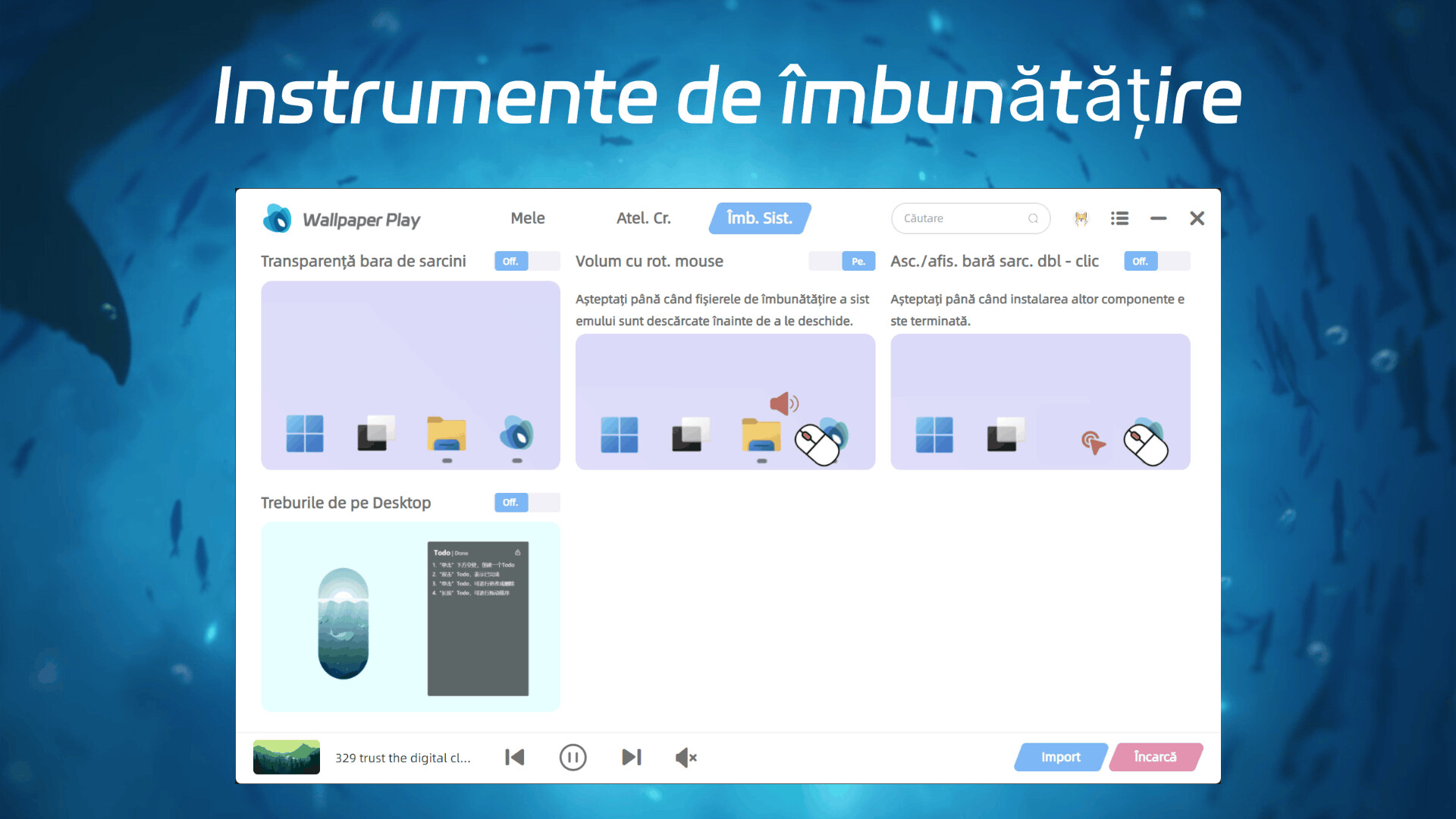 Fundaluri dinamice: Susține utilizarea videoclipurilor ca fundal, făcând ca desktopul să se elibereze de stare statică. Atelierul de creativitate are o bogăție de resurse și oferă o varietate mare de videoclipuri disponibile pentru descărcare, care sunt actualizate constant. Utilizatorii pot, de asemenea, încărca propriile lor fundaluri!