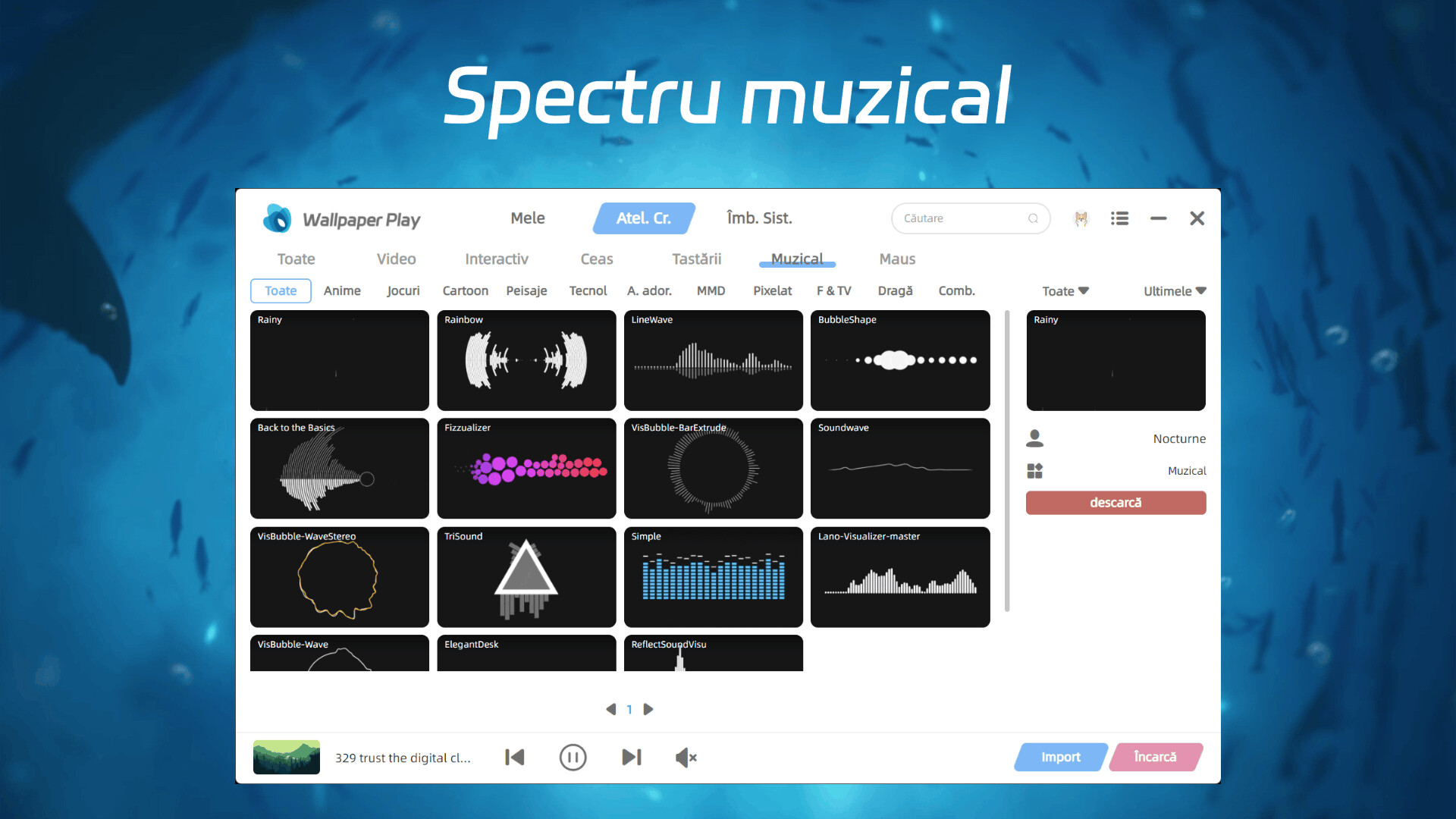 Spectru muzical: Există mai multe stiluri de spectru care urmăresc în timp real sunetul sistemului și îl vizualizează pe desktop. În timpul reproducției muzicii, spectrul bate și se schimbă în funcție de ritm, creând un aer dinamic pe desktop pentru iubitorii de muzică.