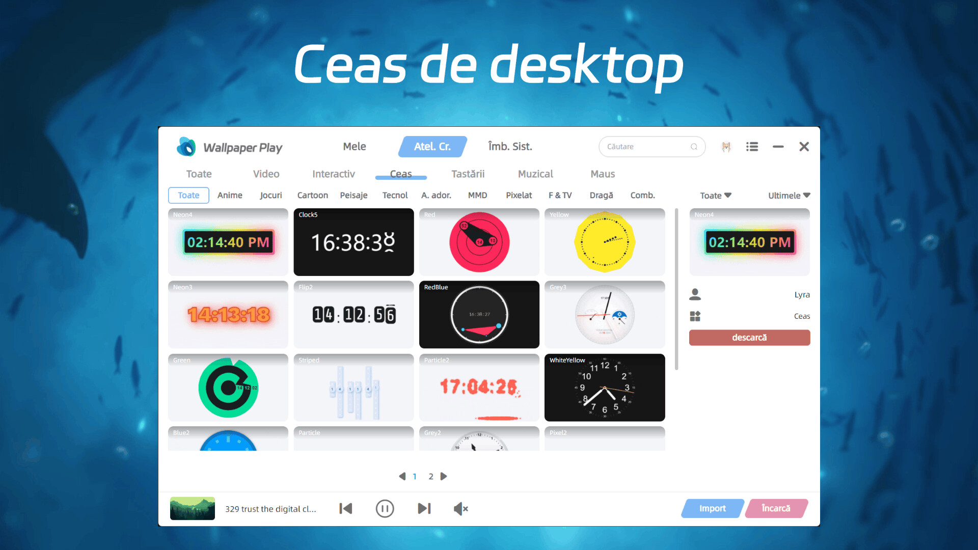 Ceas de desktop: Ceasul este afișat pe desktop și are o varietate de stiluri. Poți alege atât un ceas digital simplu și elegant, cât și un ceas cu aiguile vintage. În plus ca te ajută să verifici ușor ora, adaugă și o decorare utilă la desktop.