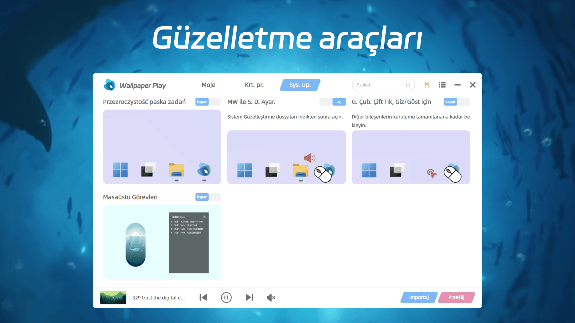 Dinamik Masaüstü Arka Planları: Videoları masaüstü arka planı olarak kullanmayı destekler, böylece masaüstü statik durumdan ayrılır. Kreatif Atölyesi zengin kaynaklara sahiptir ve çok sayıda video indirme imkanı sunarak sürekli olarak güncellenir. Kullanıcılar ayrıca kendi masaüstü arka planlarını da yükleyebilir!