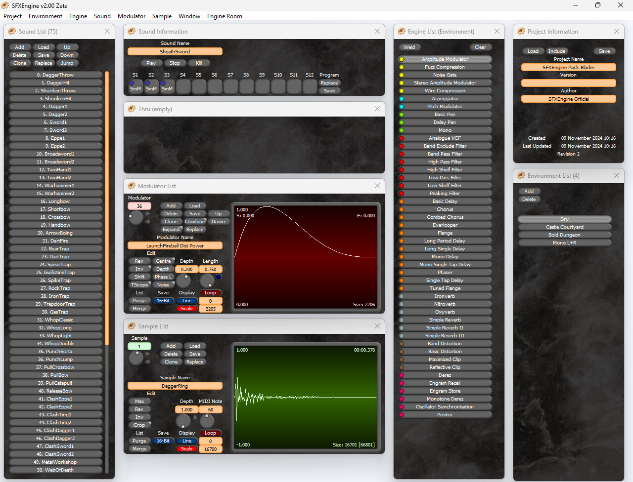 A set of 75 melee weapon sounds in SFXEngine project format. This pack contains bladed weapon effects, punches, and some dungeon-style trap sounds. Each weapon contains different variations to avoid repetition. Bow and arrow sounds, and sounds for sheath/unsheath weapons are included for convenience. Metallic clash and crash noises are included too, as well as whop and whip sounds to make it easy to create new weapon effects if needed. Contains 75 sounds, 4 environments, 50 samples, 36 modulators.