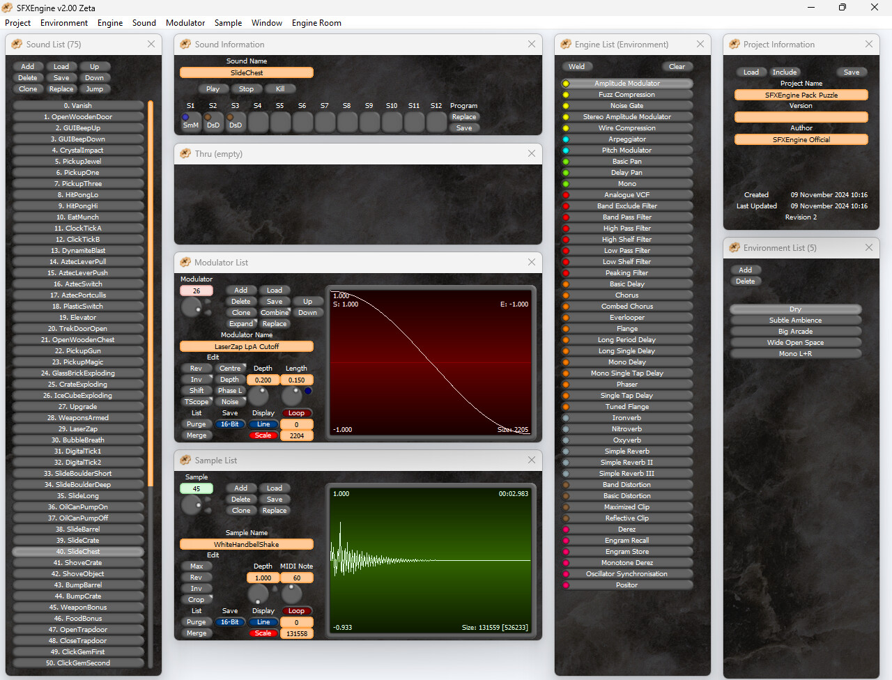 A set of 75 puzzle game sounds in SFXEngine project format. The set includes pick-up and drop sounds, some explosions and effect sounds, along with levers, sliding or pushing objects, and a sparkly vanish and collection sounds. Tile-flip sounds and buzzers round off this useful general set for all sorts of game. Contains 75 sounds, 5 environments, 45 samples, 65 modulators.
