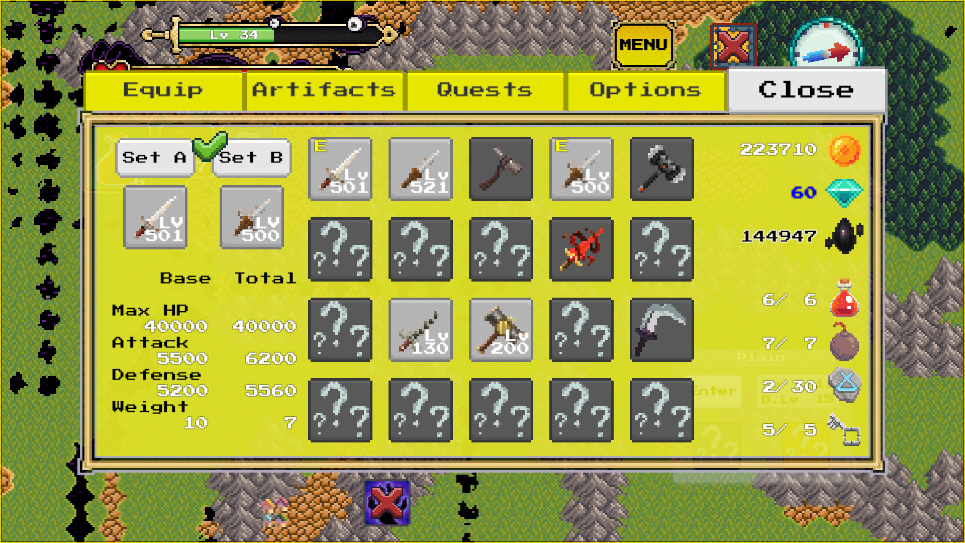 In The Rogue of Nexus, time is the most precious resource. Each dungeon is a frantic race against time, with the looming threat of the Hand constantly pushing you forward. Collect powerful artifacts to improve your skills. Each run is a new challenge, and each failure will give you the boost to get back up even stronger.