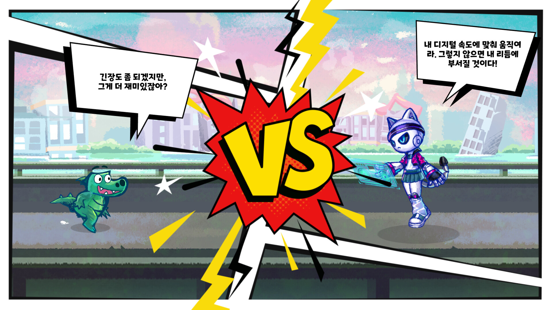 엘라와 버드의 리듬에 맞춰 강렬한 타격을 날리고, 폭발적인 피버타임으로 보스를 무력화하세요! 다채로운 음악과 역동적인 액션이 결합된 새로운 리듬 액션의 세계가 펼쳐집니다!