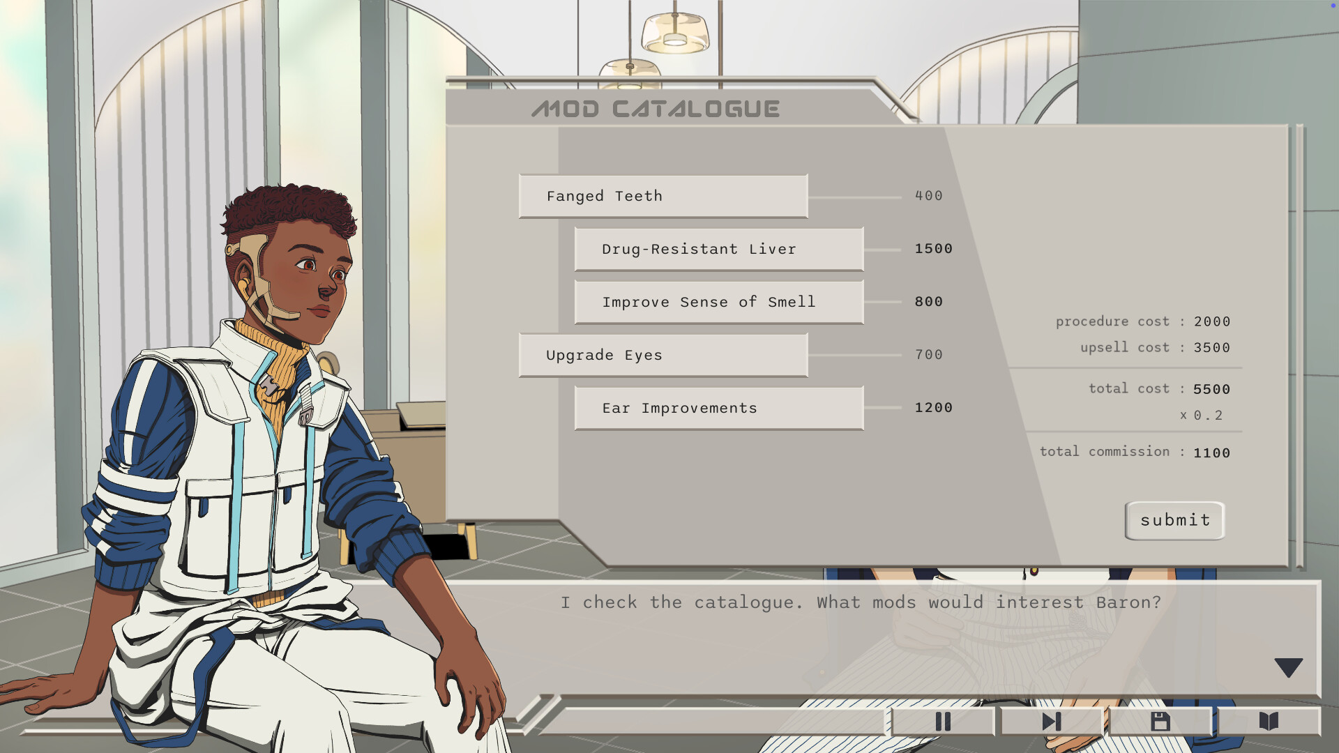 Work as a body modification consultant in a dystopian future. Talk to clients, make recommendations, and decide how much to upsell them. Balance helping others with earning enough to save your sick rabbit. Make decisions and change lives.