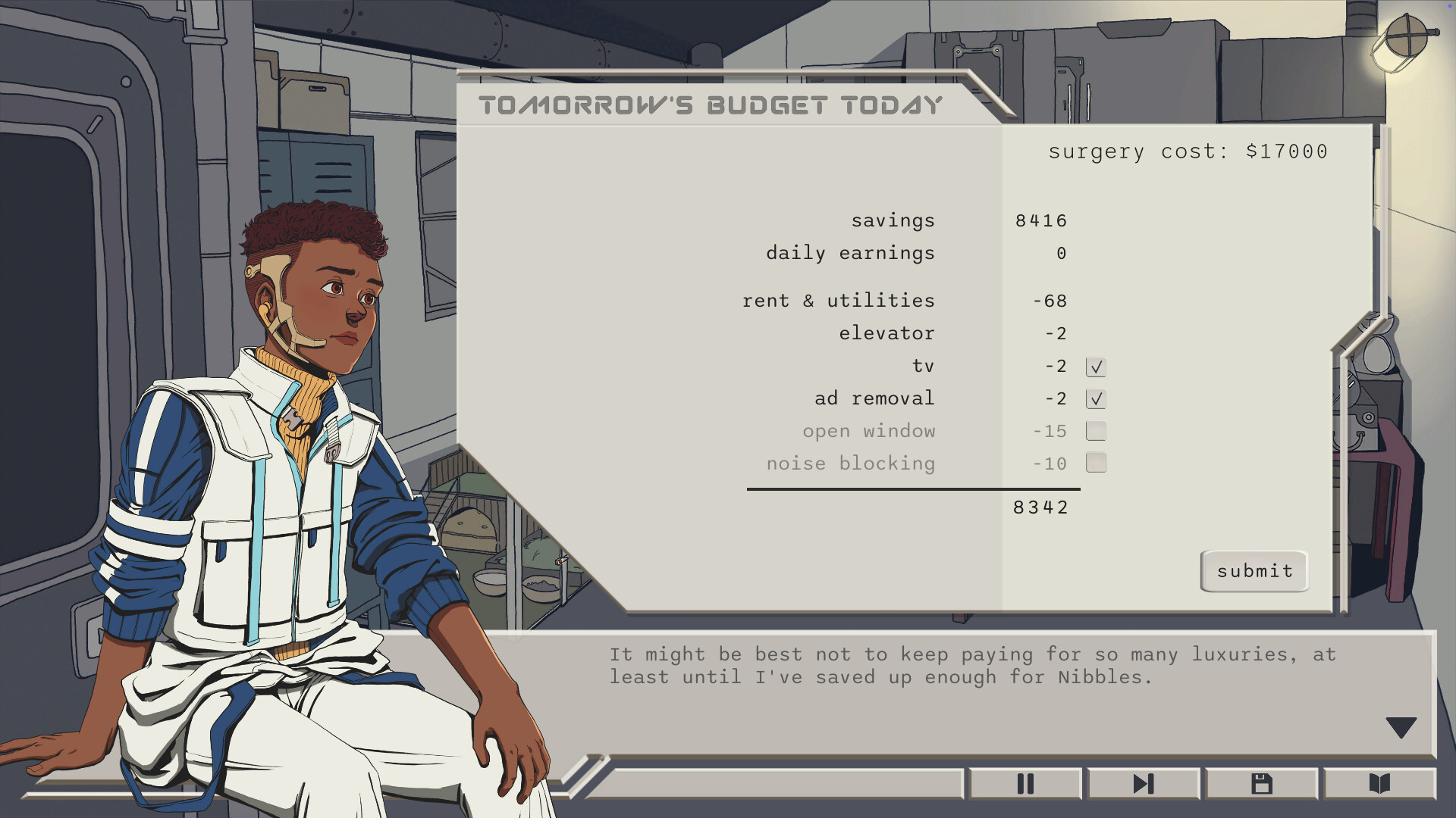 [[FULL GAME ONLY]] At the end of each day, budget your finances and decide what luxuries you want to spend on (if any). Plan and allocate money to ensure you have enough saved up to afford your rabbit’s surgery at the end of the two weeks.