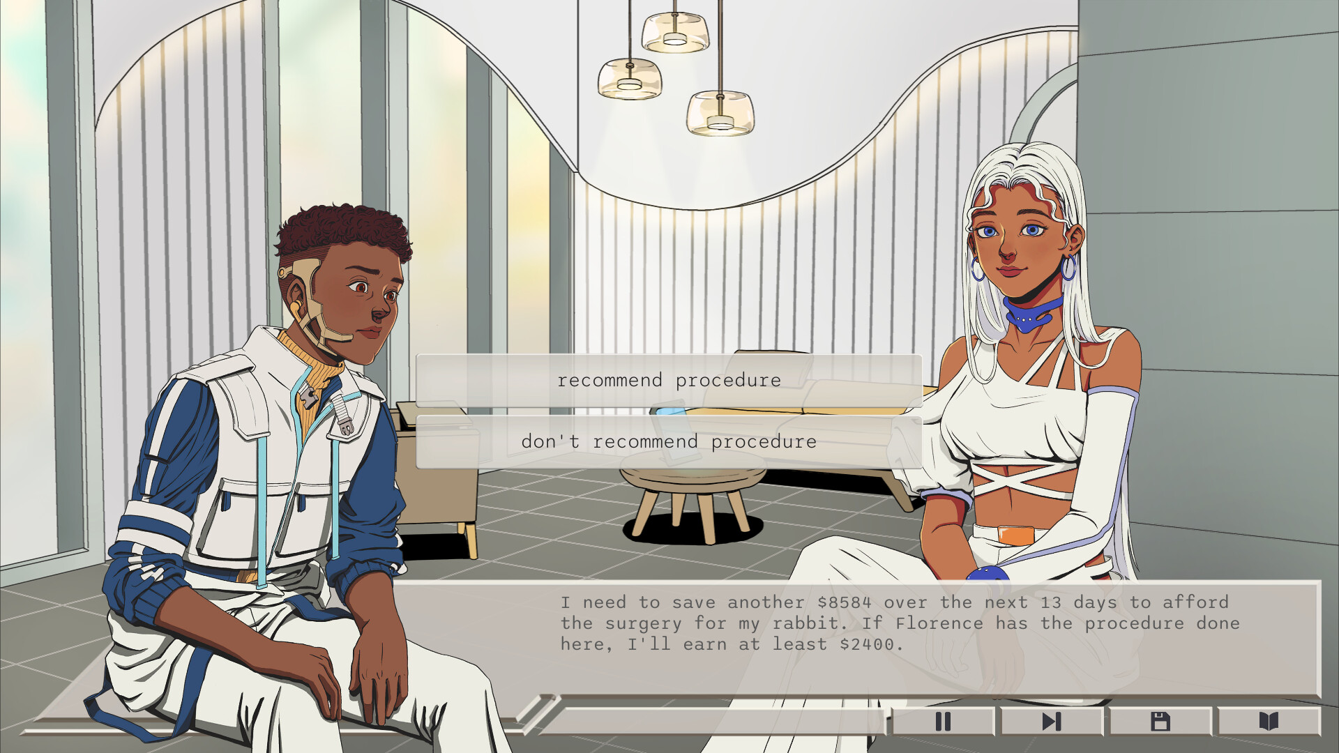 Work as a body modification consultant in a dystopian future. Talk to clients, make recommendations, and decide how much to upsell them. Balance helping others with earning enough to save your sick rabbit. Make decisions and change lives.