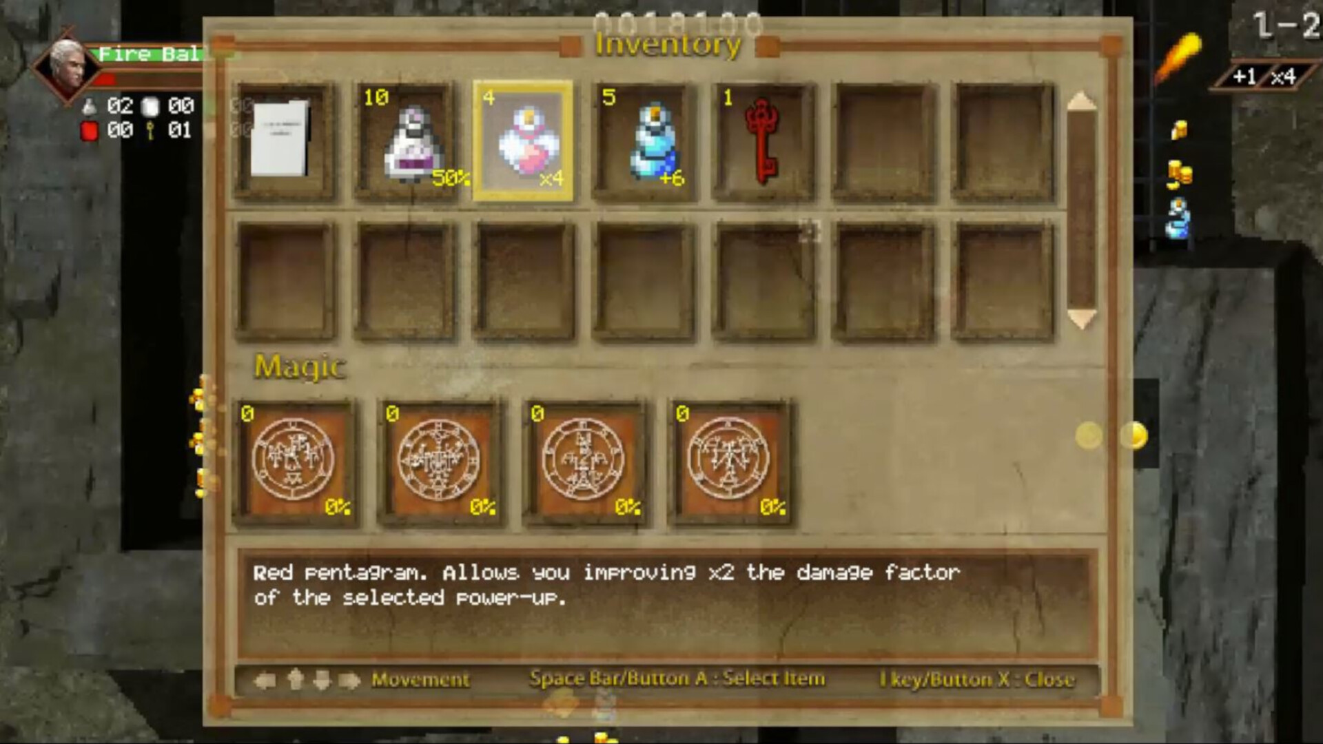Items: The game includes a variety of items. Some are picked up automatically, like white flasks (to increase shots) or violet magic potions. Most items go into the inventory, but some, like energy potions, provide immediate effects.