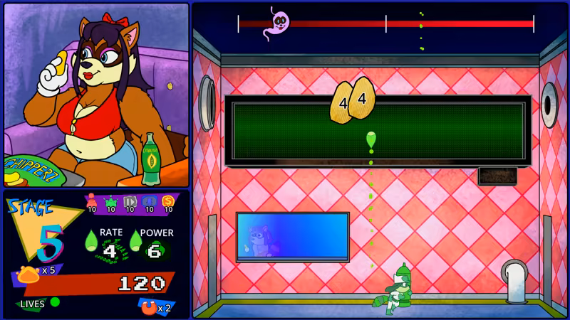 Digest the ravenous Rebbecca's meals in this arcade style run and gun erotic comedy game. Dodge and blast the chewed food, collect powerups, and spend lipids at the upgrade shop to survive the challenge and prevent indigestion! For mature players.