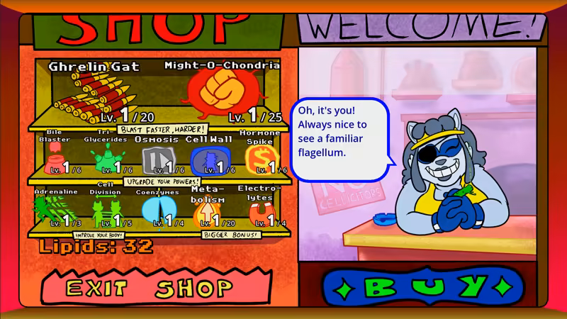 Collect lipids, then spend them at the shop to upgrade your blaster, make power-ups last longer, increase the appearance of lipids and enzymes, or even divide yourself for extra lives, and increase your odds of survival in this escalating challenge through 40 fattening levels, as the difficulty increases along with Rebbecca's weight!