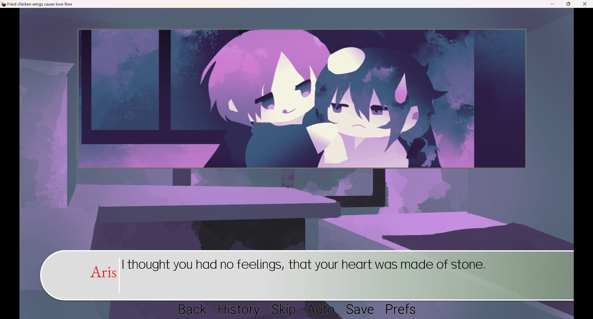 - Cannibalism X superpowers X Suspense X Original worldview - "Fried Chicken Wings Cause a Love Fire" is a BL mystery comedy long visual novel. It uses the first-person perspective with a fixed protagonist, Aris; contains elements of horror and sexual innuendo.