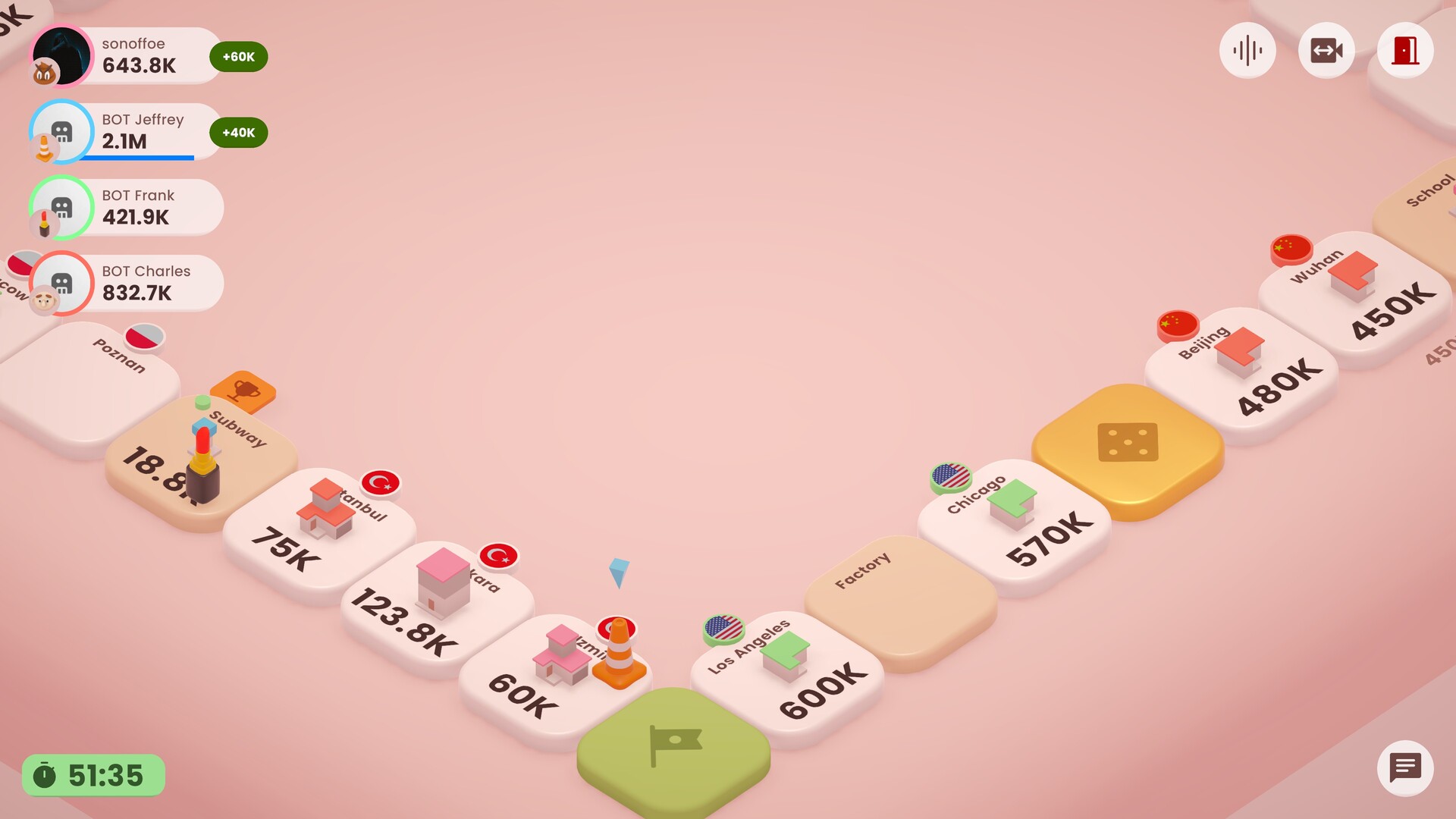 Step into a world of strategy, luck, and endless fun in this fast-paced multiplayer board game! Compete against friends or players from around the globe as you buy, upgrade, and dominate unique locations on the board. With quirky characters, hilarious interactions, and unexpected twists, every match is a fresh challenge.