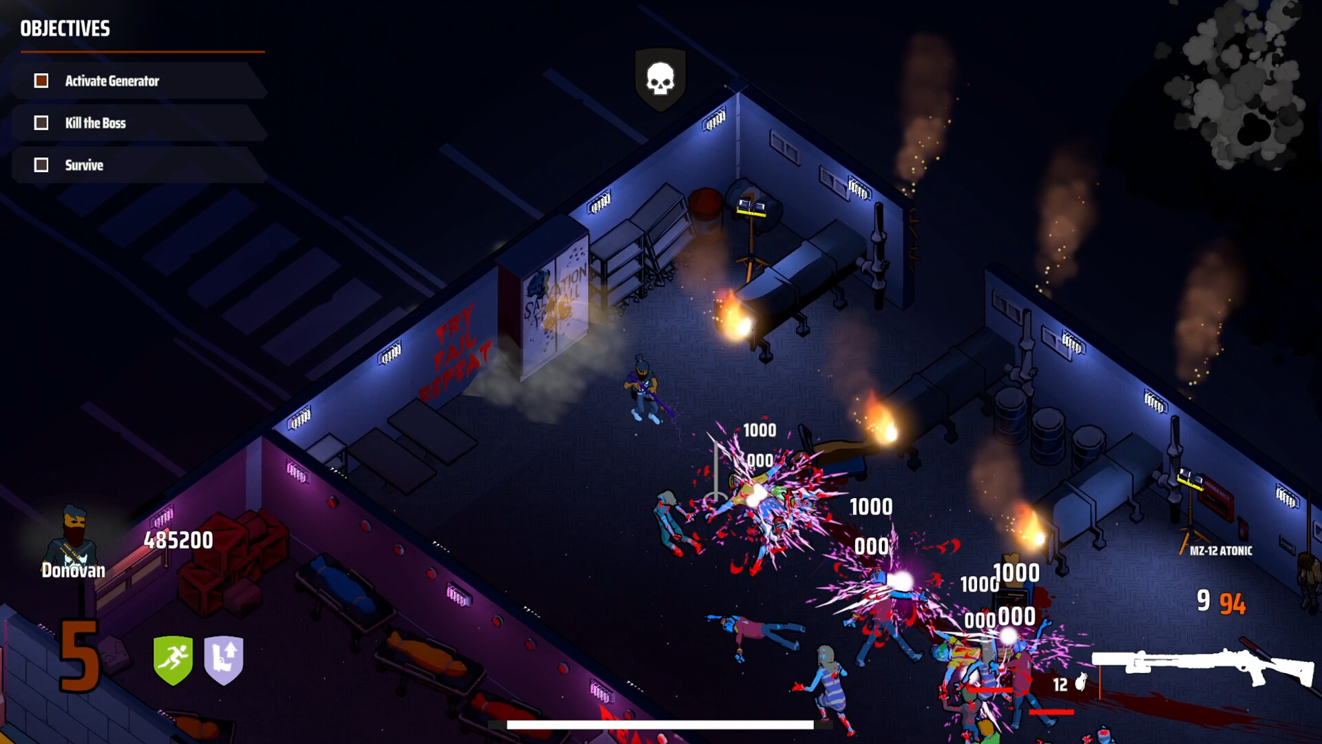 Survive waves of zombies with various heroes, unlocking increasingly powerful weapons in a post-apocalyptic world with escalating difficulty. Gain experience and complete challenges in this third-person bullet hell.