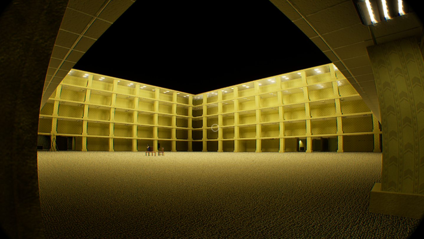 • Level 0: The starting point of your nightmare. Navigate through the dimly lit, yellow-tinted hallways filled with old, musty carpets and flickering fluorescent lights.
