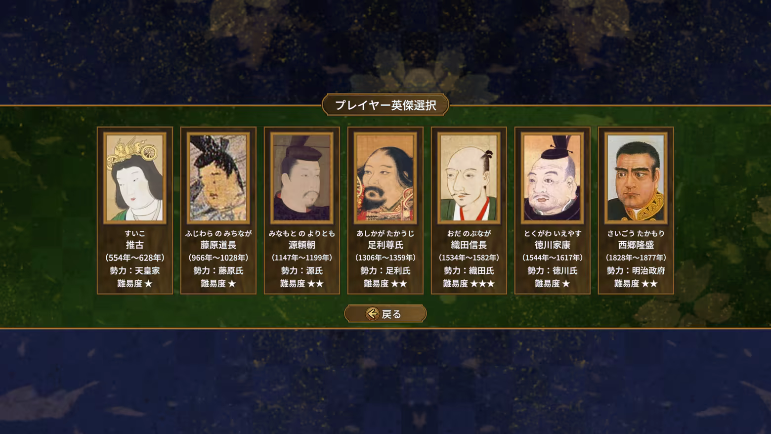 • 英傑を選択:日本の歴史上の英傑達から1人を選択し、ゲームをスタート。