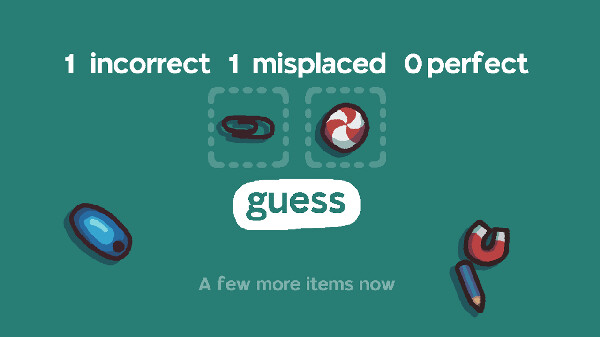 A deceptively hard little game of deduction. I’ve emptied my pockets onto the table, and I’m now thinking of a specific combination of those items. Can you guess it in as few guesses as possible?