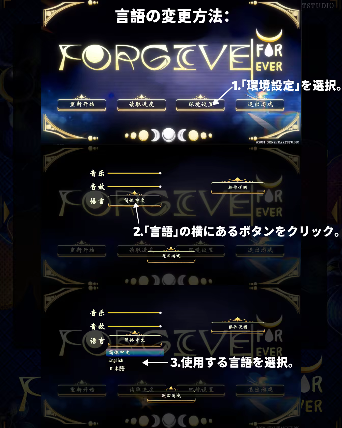 ゲームインターフェースが他の言語で表示されている場合、左から3番目のボタンをクリックし、上から3番目の項目で「简体中文/English/日本語」から選択してください。