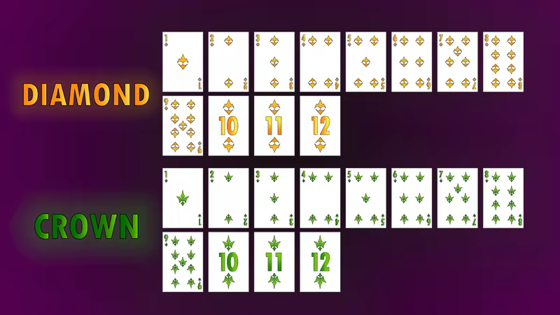 • Each player is dealt 2 cards. There are two decks in play: Diamond Deck and Crown Deck (numbered 1 through 12).