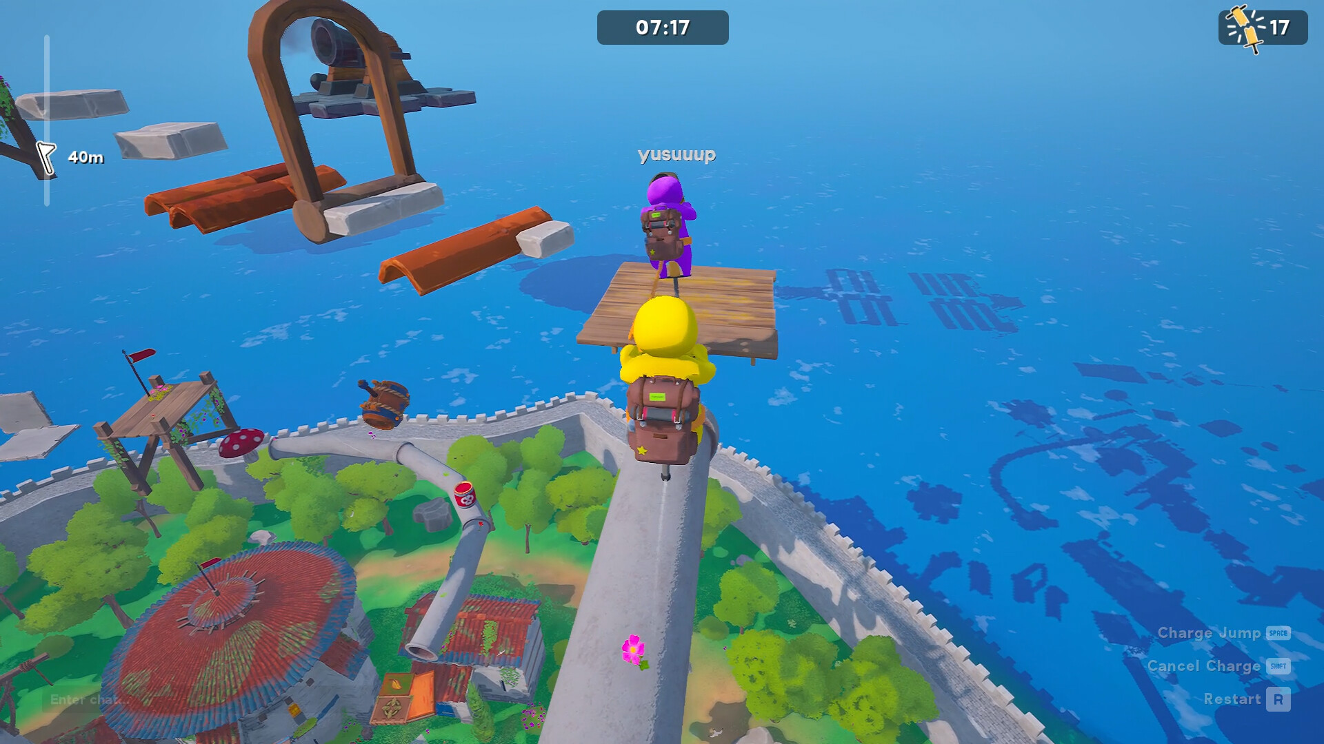 You must overcome obstacles by jumping together with your friends. If you don't want to fall, make sure to jump in sync with your teammates!
