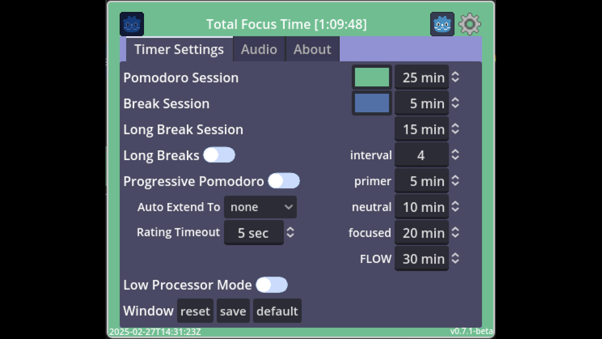 Just need a pomodoro timer to use right now? I've got you covered! Polyfocus Demo is just that with some additional but limited features you can customize and use to your own preferences.