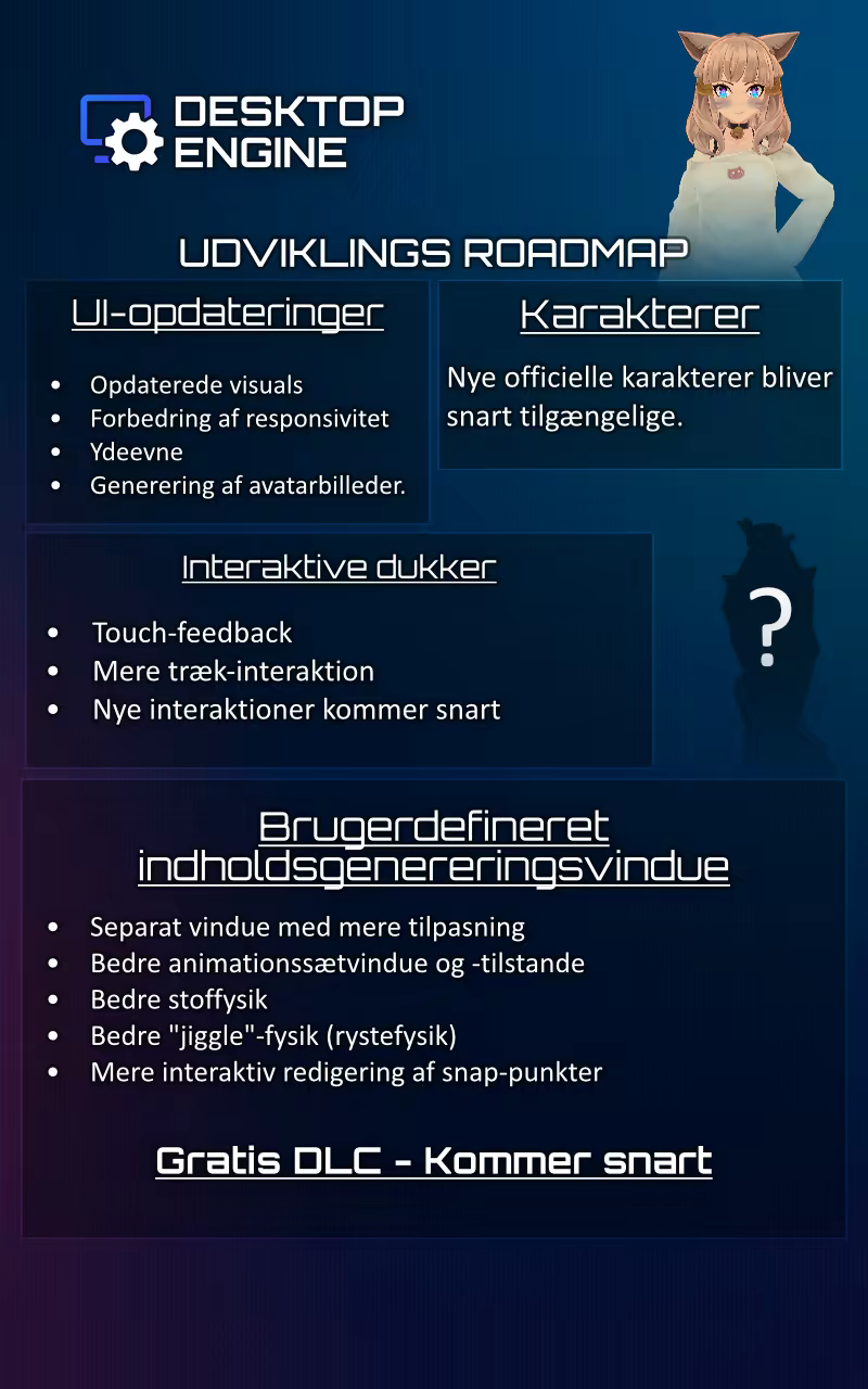 Desktop Engine er innovativ software, der omdanner statiske baggrunde til et dynamisk og interaktivt rum ved at bringe 2D- og 3D-karakterer, chatbokse, avatarsystemer og mere til dit skrivebord. Uanset om du er streamer, gamer eller bare en bruger, der ønsker at personliggøre dit skrivebord; Desktop Engine tilbyder en unik, livlig og fuldt kontrollerbar oplevelse for dig.