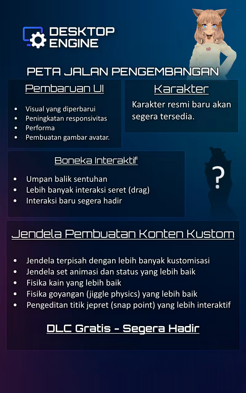Desktop Engine adalah perangkat lunak inovatif yang mengubah latar belakang statis menjadi ruang dinamis dan interaktif dengan menghadirkan karakter 2D dan 3D, kotak obrolan, sistem avatar, dan lainnya ke desktop Anda. Baik Anda seorang streamer, gamer, atau sekadar pengguna yang ingin mempersonalisasi desktop Anda; Desktop Engine menawarkan pengalaman unik, hidup, dan sepenuhnya dapat dikontrol untuk Anda.