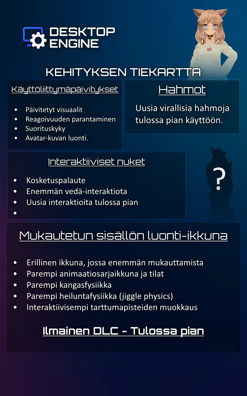 Desktop Engine tarjoaa paljon enemmän kuin tavallinen työpöytäsovellus. Sen tehokas sisäänrakennettu editori, tuki sekä 2D- että 3D-malleille, fysiikkamoottori, optimoitu suorituskyky ja interaktiiviset ominaisuudet, kuten hiiren/katseen seuranta, antavat sinulle vapauden luoda täysin ainutlaatuisen ja elävän työpöytäkokemuksen.