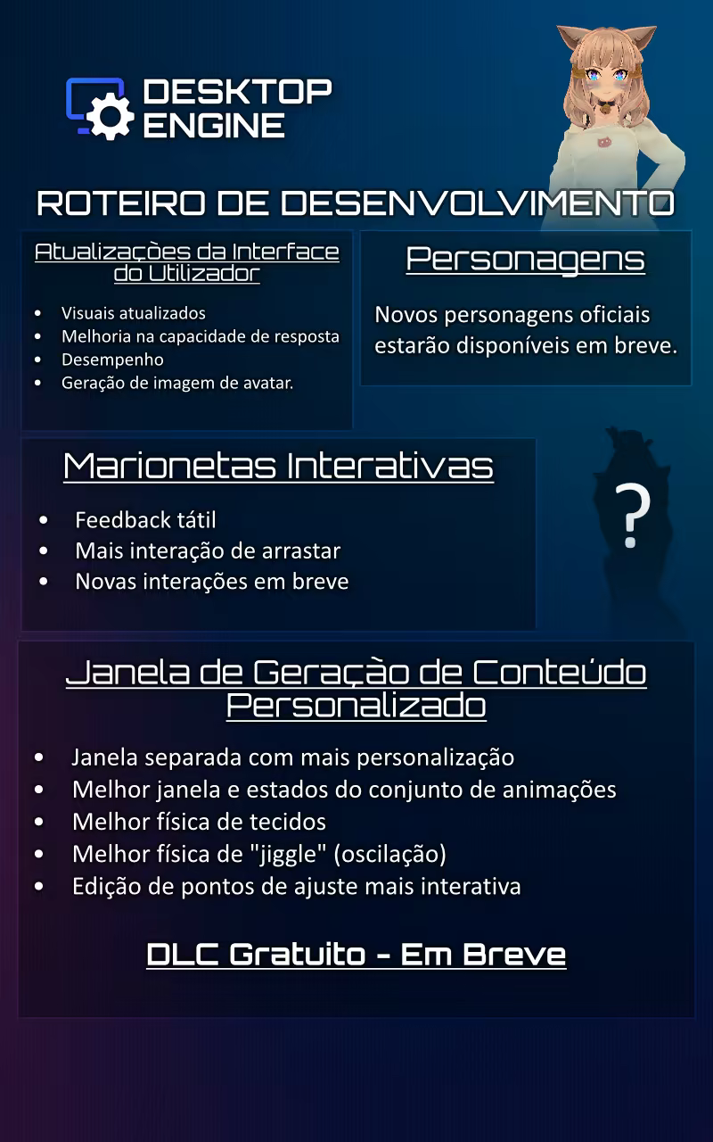 O Desktop Engine transforma o seu ambiente de trabalho numa plataforma interativa com personagens 2D/3D em tempo real, sobreposições dinâmicas e avatares personalizáveis — perfeito para streamers, jogadores ou qualquer pessoa que queira personalizar o seu espaço de trabalho.