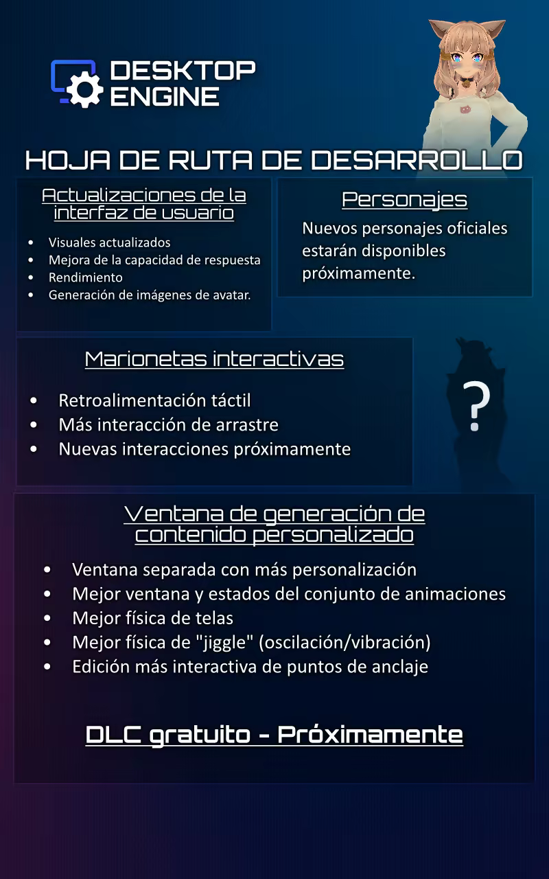 Desktop Engine es un software innovador que transforma fondos estáticos en un espacio dinámico e interactivo trayendo personajes 2D y 3D, cajas de chat, sistemas de avatares y más a tu escritorio. Tanto si eres streamer, jugador o simplemente un usuario que quiere personalizar su escritorio; Desktop Engine te ofrece una experiencia única, viva y totalmente controlable.