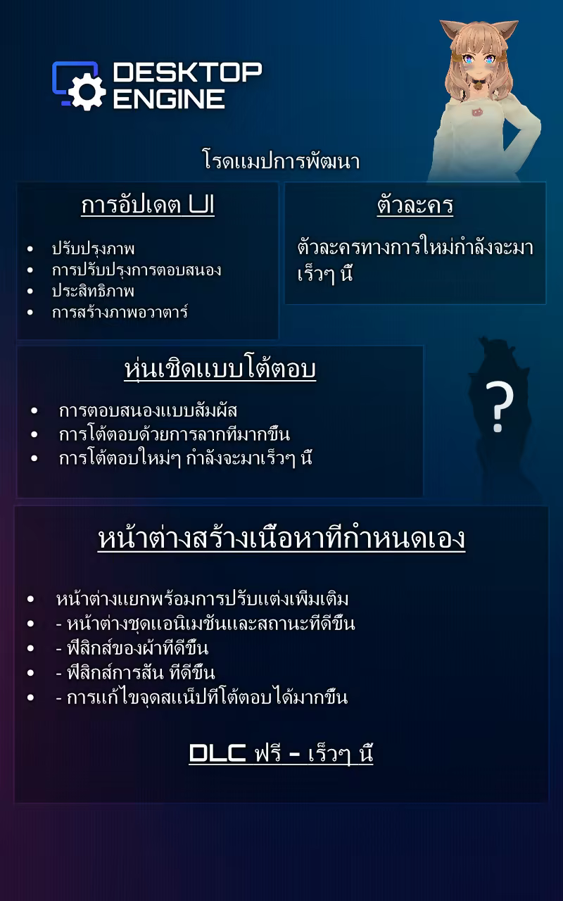 Desktop Engine เป็นซอฟต์แวร์นวัตกรรมที่เปลี่ยนพื้นหลังคงที่ให้เป็นพื้นที่แบบไดนามิกและโต้ตอบได้ โดยนำตัวละคร 2D และ 3D, กล่องแชท, ระบบอวาตาร์ และอื่นๆ มาสู่เดสก์ท็อปของคุณ ไม่ว่าคุณจะเป็นสตรีมเมอร์, เกมเมอร์ หรือเพียงผู้ใช้ที่ต้องการปรับแต่งเดสก์ท็อปของคุณ; Desktop Engine มอบประสบการณ์ที่ไม่เหมือนใคร มีชีวิตชีวา และควบคุมได้อย่างเต็มที่สำหรับคุณ