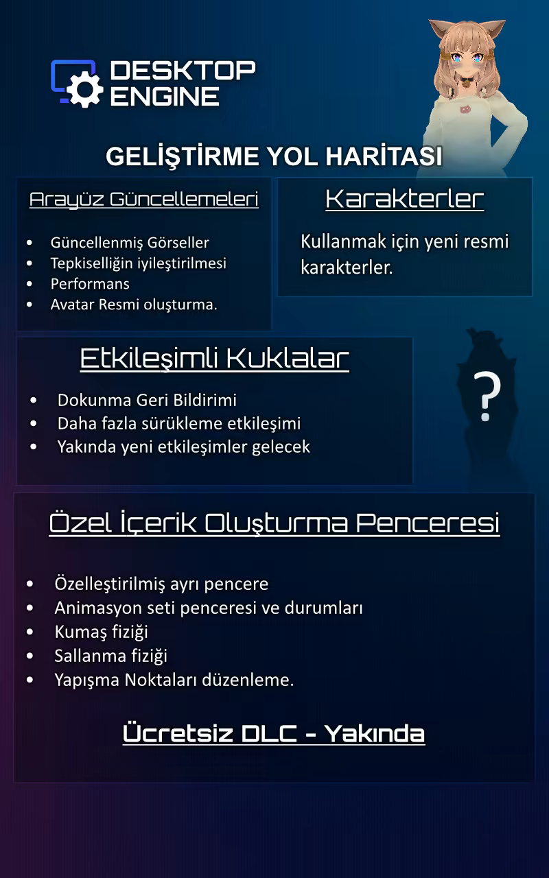 Desktop Engine, statik arka planları dinamik ve etkileşimli bir alana dönüştüren, 2D ve 3D karakterleri, sohbet kutularını, avatar sistemlerini ve daha fazlasını masaüstünüze getiren yenilikçi bir yazılımdır. İster yayıncı, ister oyuncu, ister sadece masaüstünü kişiselleştirmek isteyen bir kullanıcı olun; Desktop Engine size eşsiz, canlı ve tamamen kontrol edilebilir bir deneyim sunar.