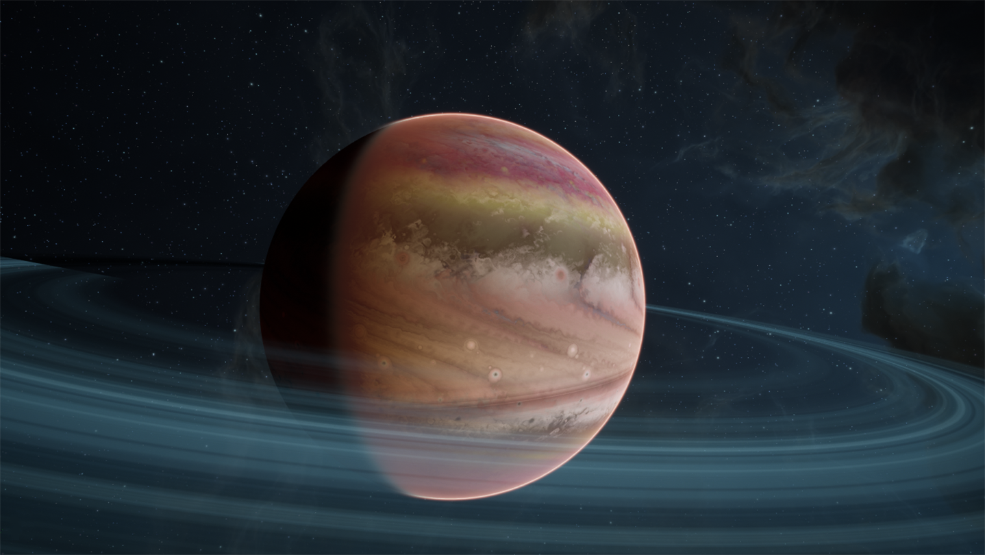 In the 798th parallel universe, there exists a gaseous planet known as "Gas Giant Voyage". It is entirely gaseous with no land, composed of various elemental gases, including metal elements and dust left by meteorites tearing through the atmosphere, all floating in the air.