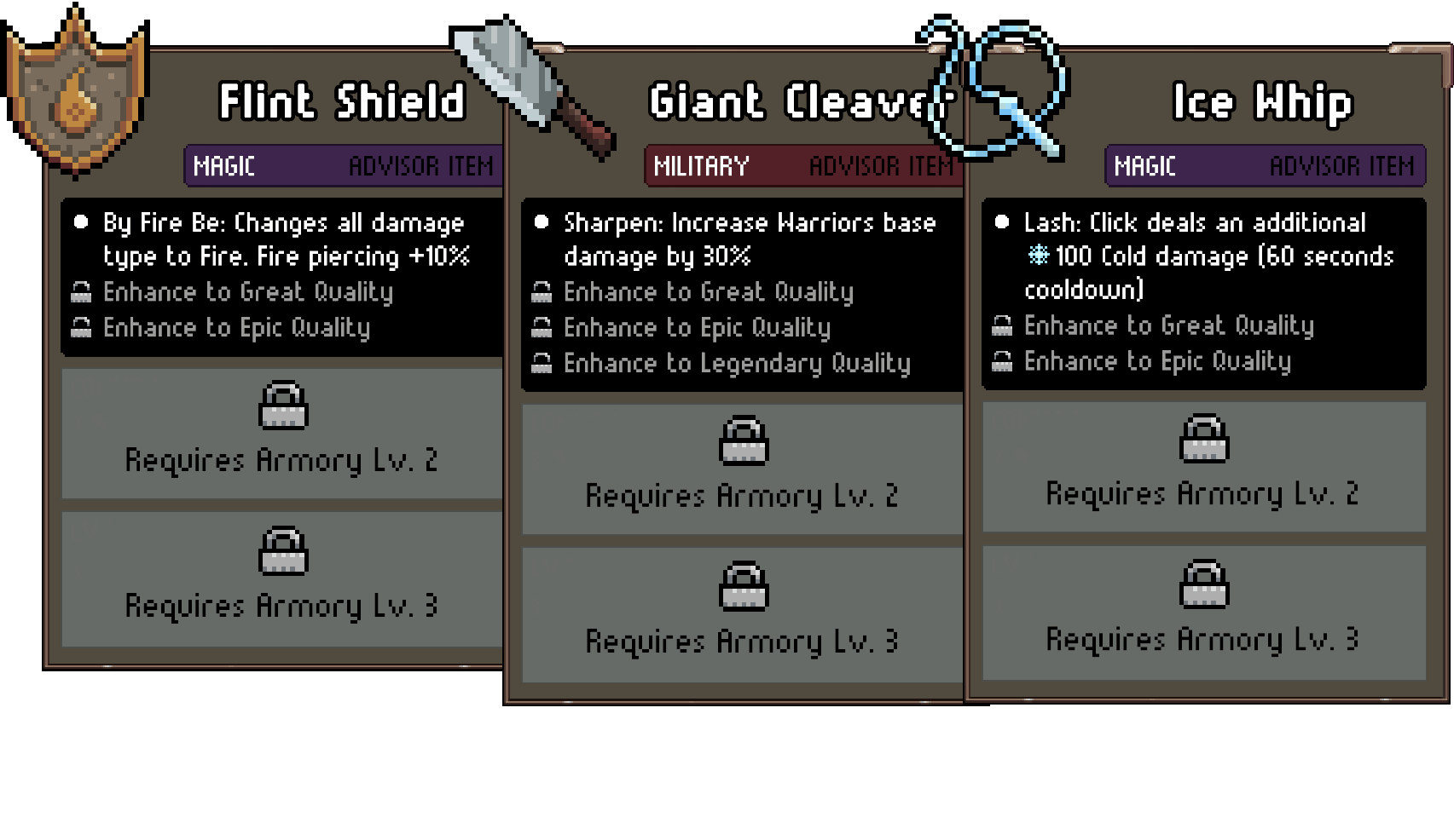 Upgrade items to discover additional unique effects. Select advisors specialized in either military, economy, or magic. Equip advisors with powerful items. Combine it with synergetic town upgrades to unleash crazy combos to annihilate bosses even faster.