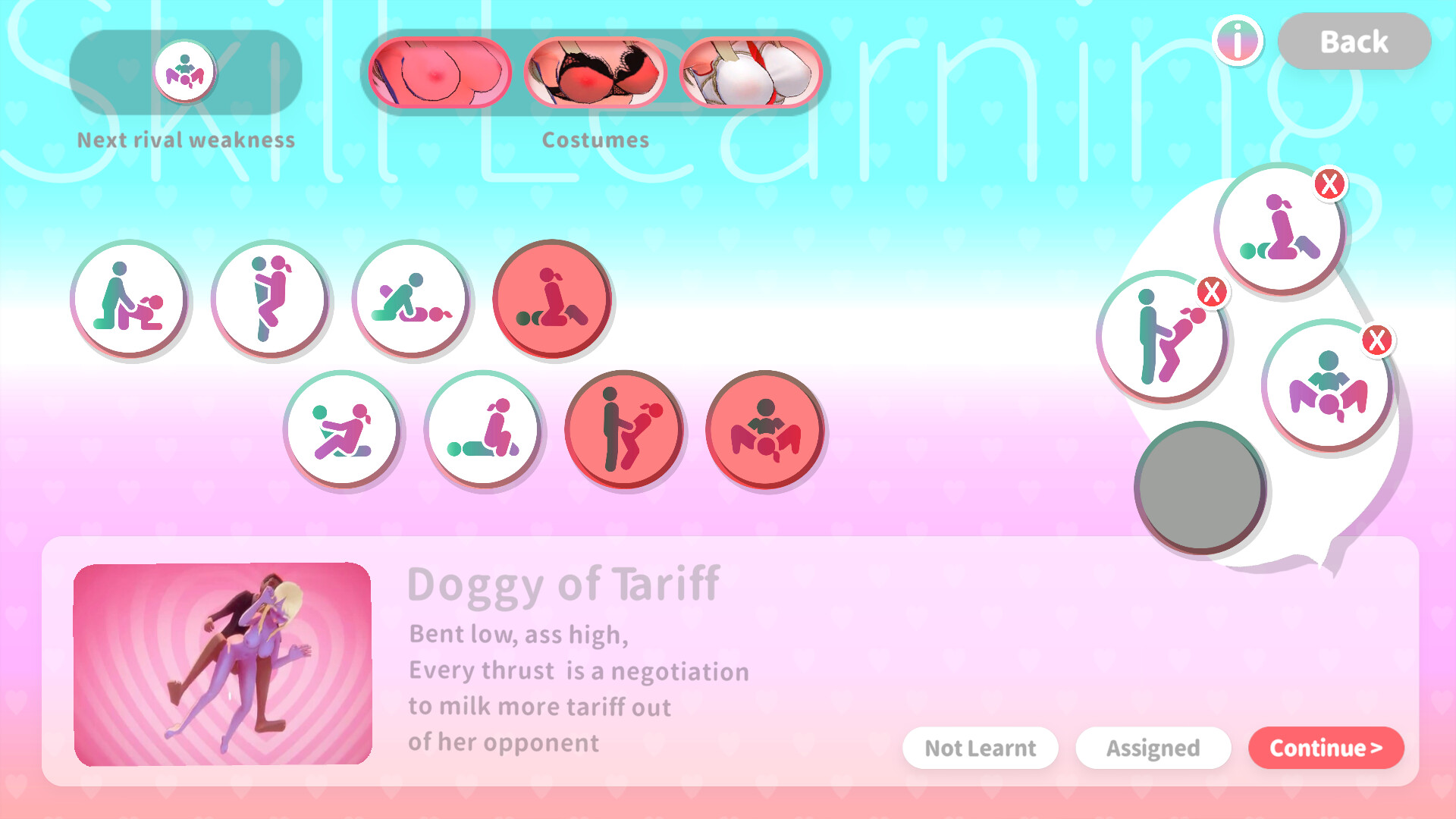 Master a variety of distinct poses, skills, and subskills to earn an SSS grading, boosting your score and Tariffs. After each match, choose between [Training] your intimate skills to enhance your performance, or [Memorizing] the memories to uncover hidden stories and ultimately unlock secret characters.
